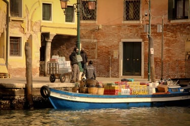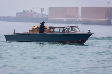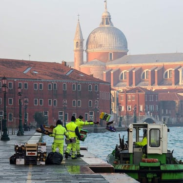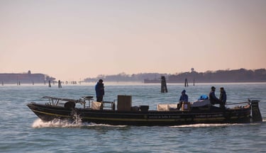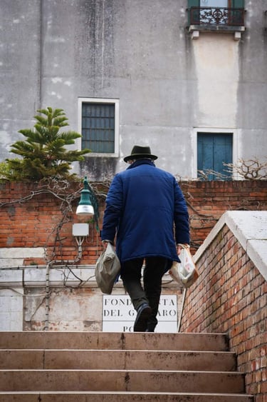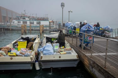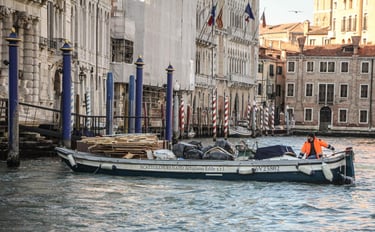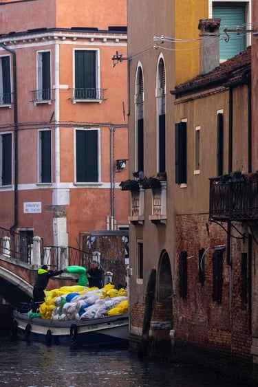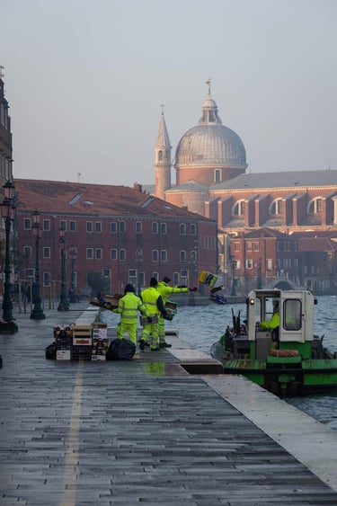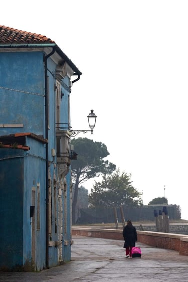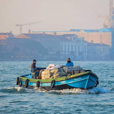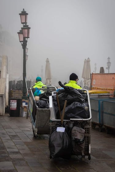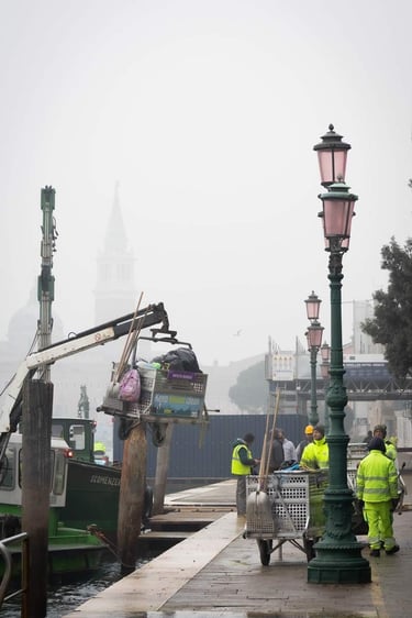 Fevrier 2024, je ne compte plus mes passages sur cette île flottante. Je tombe amoureuse du brouillard, je guette les Cantonniers pour les prendre en photo, je cours derrière les livreurs de marchandise, je passe des heures à regarder les bateaux chargés de nourriture, linge, cartons... Et pendant cette découverte qui m'émerveille, je file aux lieux stratégiques des photos, admirant la comédie de carnaval à Venise, découvrant que le rêve est une supercherie pour celui qui connaît les lieux, et à la fois charmée par le travail dans les costumes. Je ne me lasse pas de cet endroit, je découvre toujours et encore des rues, ruelles et chemins au bord de l'eau.