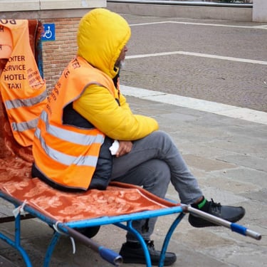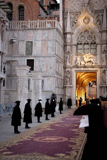 Fevrier 2023, une claque magistrale, l'ouverture des frontières post covid, difficile de se déplacer dans les rues sans se gêner. Je passerai beaucoup de temps à observer les travailleurs locaux dans ce brouhaha humain. Leur patience, parfois leur invisibilité. Chaque matin, la cité des canaux était reluisante et pourtant chaque soir elle débordait de confettis et autres déchets des touristes. La foule étant étouffante, je passerai mon temps à me déplacer dans chacune des iles pour les visiter, je ferai également 1 h 30 de gondole pour mon anniversaire, mais: Seule! Le charme est un peu perdu au bout de 30 minutes. 2023, c'est surtout la rencontre des costumés,et du planning régulier pour les photos. Alors, le dernier jour ayant enfin pris connaissance des rendez-vous photos des costumés, je commencerai mon marathon à l'arsenal.