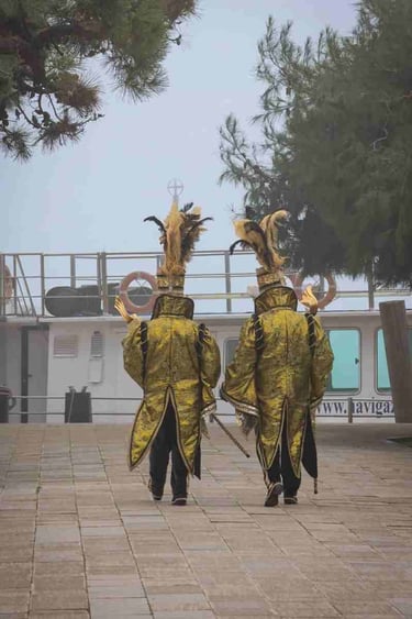 9h, ligne 14 direction Burano. Photographes et Costumés sont au rendez-vous. L’attente du transport dans l’agitation carnavalesque. Dans ma tête tourne en boucle : « Sarà perché ti amo » horrible 🤣🤣.